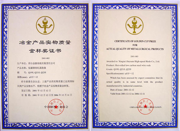低碳鋼熱軋圓盤條Q195,Q215,Q235獲冶金產(chǎn)品實物質(zhì)量金杯獎