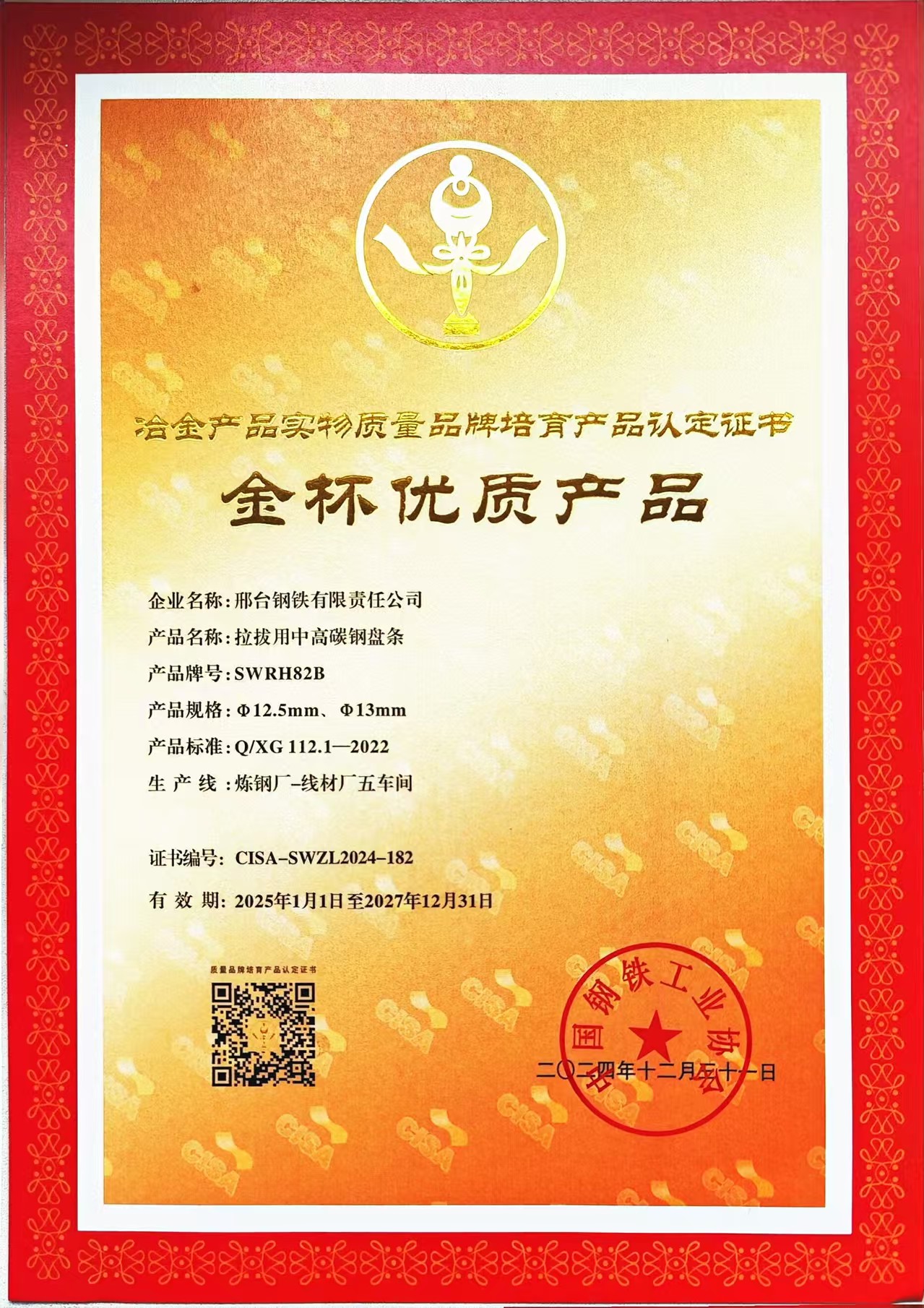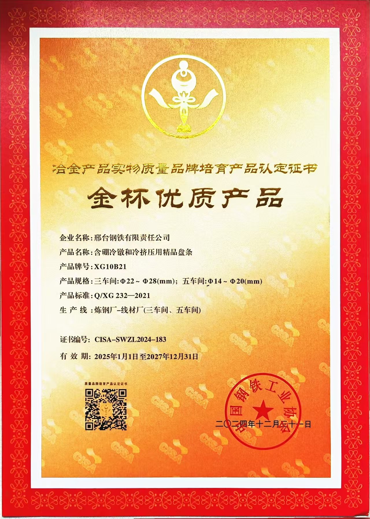 2024年公司含硼冷鐓及冷擠壓用精品盤條XG10B21產(chǎn)品獲得冶金產(chǎn)品實物質(zhì)量品牌培育產(chǎn)品(金杯優(yōu)質(zhì)產(chǎn)品)認(rèn)定證書,簡稱金杯獎。“冶金產(chǎn)品實物質(zhì)量品牌培育”評選活動于24年3月啟動,由中國鋼鐵工業(yè)協(xié)會主辦,金杯獎是中國鋼鐵工業(yè)協(xié)會組織的冶金行業(yè)唯一的比較權(quán)威的獎項,
