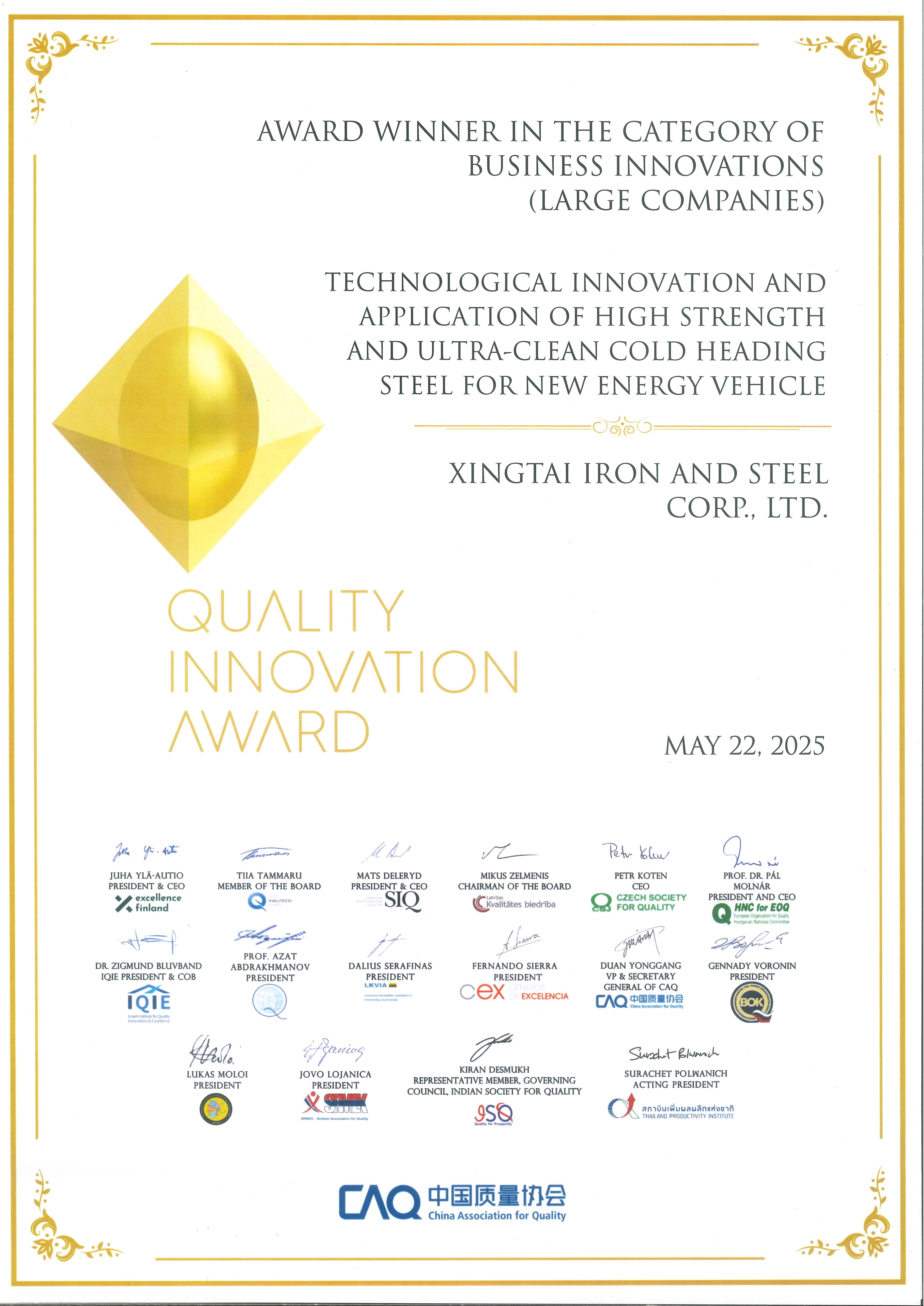 2025.5.22-23邢臺鋼鐵有限責(zé)任公司參加了在泰國舉辦的2024年國際質(zhì)量創(chuàng)新大賽發(fā)布會暨頒獎儀式,邢臺鋼鐵發(fā)布的項目《新能源汽車用高強(qiáng)度超高潔凈度冷鐓鋼技術(shù)創(chuàng)新及應(yīng)用》榮獲該大賽一等獎。這是邢鋼歷史上獲得的首個國際大獎,也是自國際質(zhì)量創(chuàng)新大賽舉辦以來,在鋼鐵領(lǐng)域首次獲得的國際大獎。