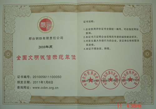 邢鋼榮獲“2010年度全國文明誠信示范單位”稱號