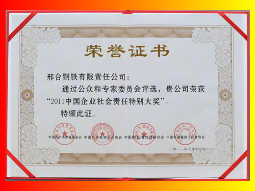 2011年6月17日,邢鋼被評選為“2011中國企業(yè)社會責任特別大獎”。