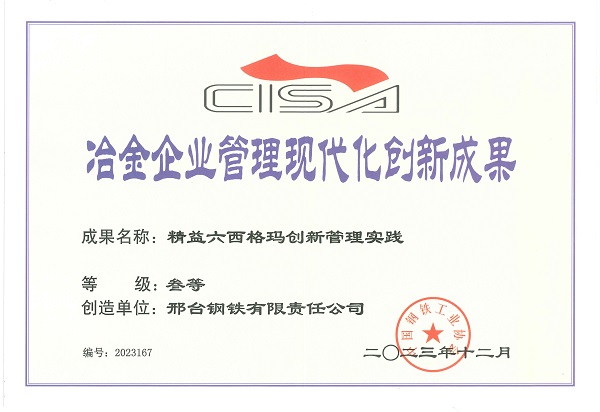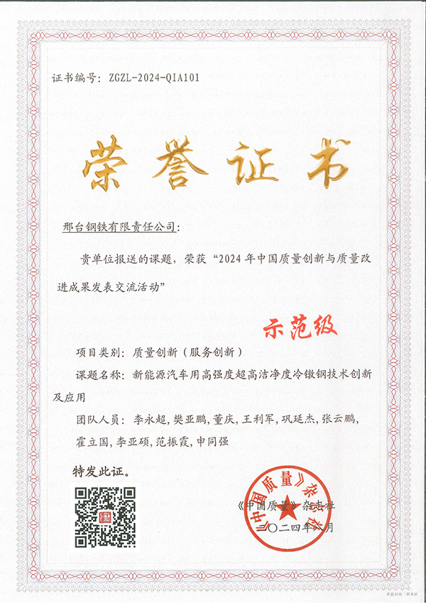 2024年8月,邢鋼《新能源汽車用高強(qiáng)度超高潔凈度冷鐓鋼技術(shù)創(chuàng)新及應(yīng)用》課題榮獲“2024年中國質(zhì)量創(chuàng)新與質(zhì)量改進(jìn)成果發(fā)表交流活動(dòng)”最高級(jí)別的“示范級(jí)”榮譽(yù)。
