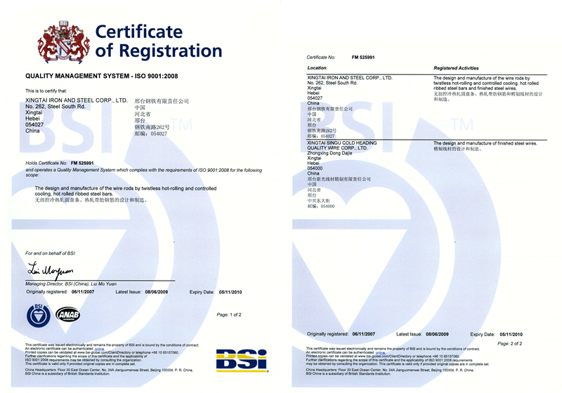 2007年11月6日,邢鋼獲ISO 9001:2008質(zhì)量管理體系認證證書。