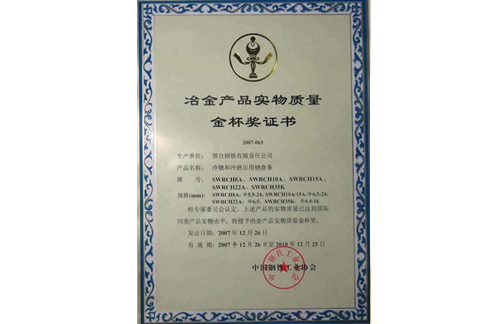 2007年12月,邢鋼冷鐓和冷擠壓用鋼盤條獲冶金產(chǎn)品實物質(zhì)量金杯獎。