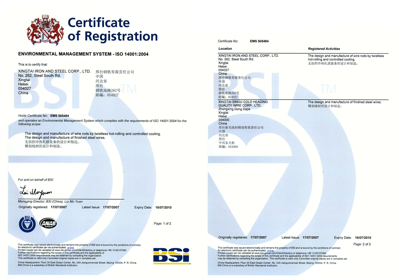 2007年7月17日,邢鋼獲OHSAS 18001:2007認證證書(職業(yè)健康安全管理體系規(guī)范)。