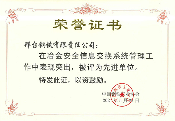 2021年5月,邢鋼在冶金安全信息交換系統(tǒng)管理工作中表現(xiàn)突出,被評為先進單位。