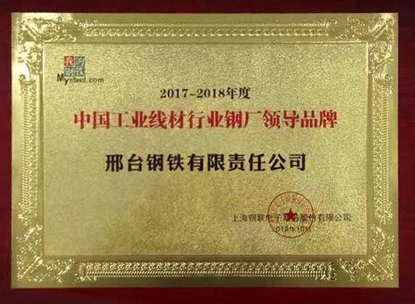 2018年10月22日,在上海舉辦的“2018年Mysteel中國工業(yè)線材暨緊固件產(chǎn)業(yè)鏈高峰論壇”上,論壇評委會根據(jù)對國內(nèi)工業(yè)線材生產(chǎn)鋼廠2017-2018年品牌、質(zhì)量和市場反饋等評比,評選出“中國工業(yè)線材行業(yè)鋼廠領(lǐng)導(dǎo)品牌”,邢鋼獲此殊榮。