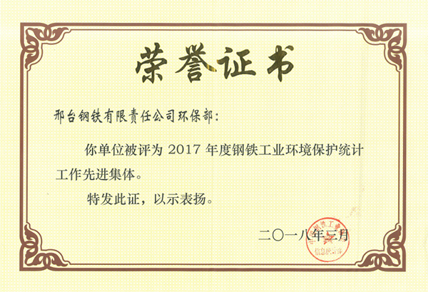 邢鋼被評為2017年度鋼鐵工業(yè)環(huán)境保護(hù)統(tǒng)計工作先進(jìn)集體