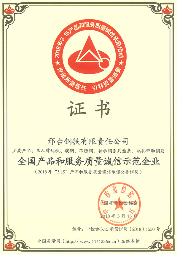 2018年3月15日,邢鋼(主要產(chǎn)品:三人牌純鐵、碳鋼、不銹鋼、軸承鋼系列盤條和熱軋帶肋鋼筋),被中國質(zhì)量檢驗協(xié)會授予“全國產(chǎn)品和服務(wù)質(zhì)量誠信示范企業(yè)”稱號。
