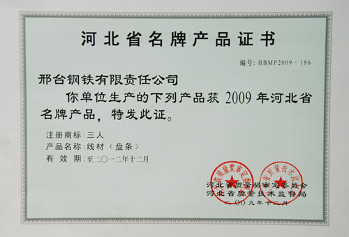 近日獲悉,2009年度邢鋼申報(bào)的“三人”牌線材產(chǎn)品,涵蓋冷墩鋼、簾線鋼、預(yù)應(yīng)力用鋼、優(yōu)質(zhì)碳素鋼、焊條用鋼、一般用低碳鋼、工業(yè)用純鐵、軸承鋼、彈簧鋼、機(jī)械結(jié)構(gòu)用鋼等十一個系列65個牌號線材產(chǎn)品榮獲“河北省名牌產(chǎn)品”。