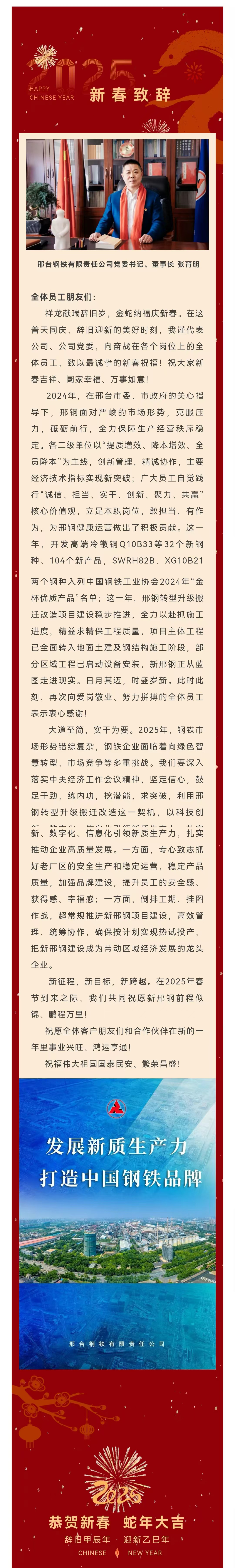 歲序更替,華章日新。1月22日,以“煥新邢鋼,榮耀啟航”為主題的邢鋼2025年新春聯(lián)歡會(huì)在公司會(huì)議中心炫彩啟帷。公司黨委書記、董事長(zhǎng)張育明攜公司全體中高層領(lǐng)導(dǎo)與2024年受表彰的先進(jìn)個(gè)人、員工代表歡聚一堂,喜迎乙巳年新春。
