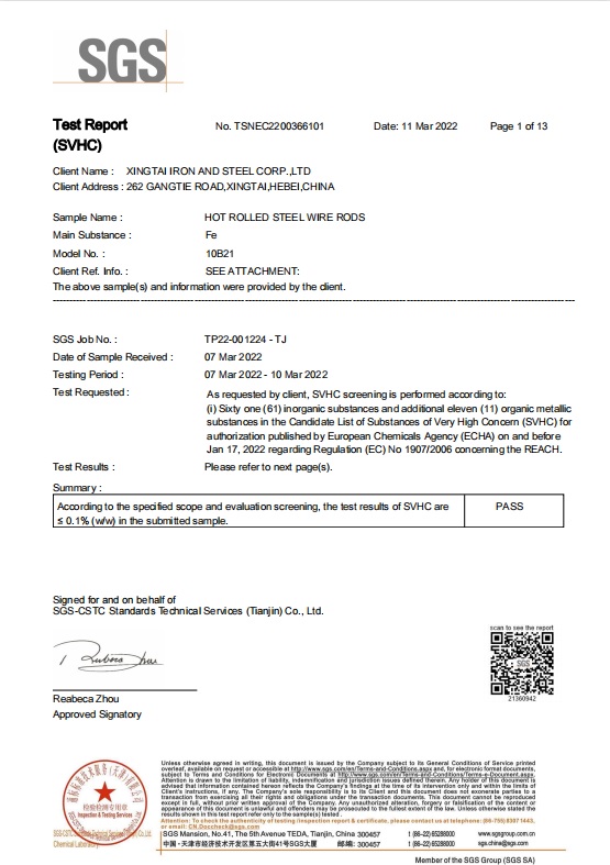 近日,邢鋼公司送交試樣到國際權威檢測機構SGS進行了歐盟限用及對人體和環(huán)境危害較大的高關注物質(SVHC)進行了檢測,結果表明:邢鋼盤條歐盟限用和有毒有害高關注物質全部“未檢出”。