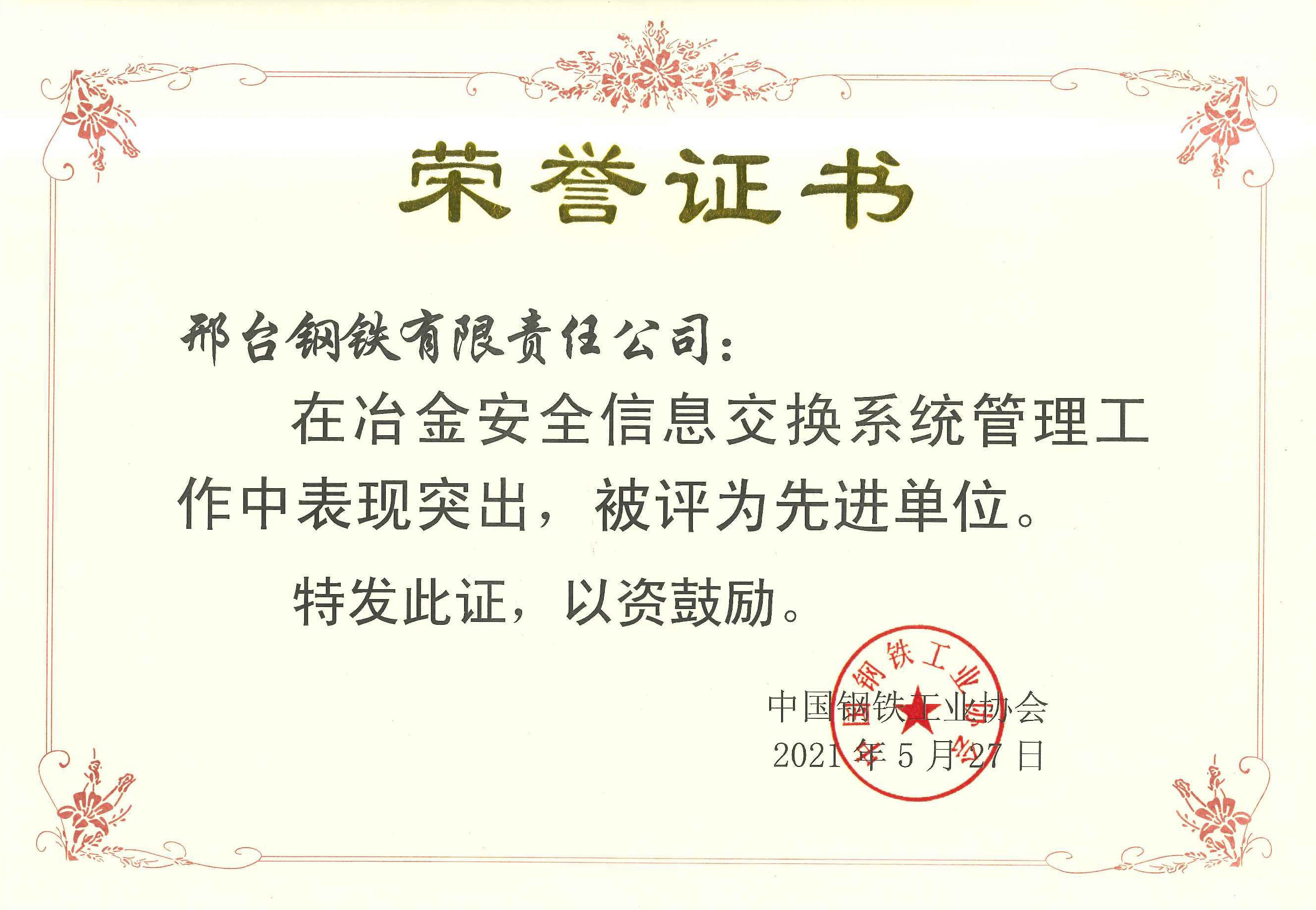 近日,邢臺鋼鐵有限責任公司(以下簡稱邢鋼)收到中鋼協(xié)〔2021〕73 號文《關(guān)于表彰冶金安全信息交換系統(tǒng)管理工作先進單位和先進個人的決定》及榮譽證書,邢鋼在冶金安全信息交換系統(tǒng)管理工作中表現(xiàn)突出,被評為先進單位。
