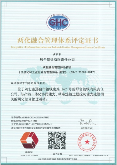 近日,邢鋼獲得兩化融合管理體系再評定證書,證書有效期:2020年12月14日至2023年12月14日。邢鋼將以此為契機,圍繞高質(zhì)量、高效率、個性化服務(wù)的發(fā)展要求,著力補齊兩化融合和智能制造短板,不斷夯實信息化基礎(chǔ)建設(shè),推進兩化深度融合,不斷提升企業(yè)核心競爭力。