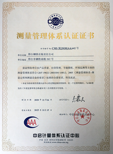 近日,邢臺鋼鐵有限責(zé)任公司(以下簡稱邢鋼)收到中啟認證中心頒發(fā)的《測量管理體系認證證書》,證書編號CMS冀【2020】AAA42號,證書有效期至2025年11月15日,證書的獲得標志著邢鋼測量體系認證證書順利實現(xiàn)換版。