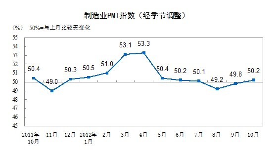 2012年10月,中國制造業(yè)采購經(jīng)理指數(shù)(PMI)為50.2%,比上月上升0.4個(gè)百分點(diǎn),重新回到臨界點(diǎn)之上。