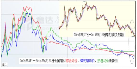 底線的提高,勢必助推中國經(jīng)濟(jì)大勢呈現(xiàn)前低后高的走勢。而經(jīng)過長期低迷的中國鋼材市場,也已經(jīng)具備逐漸走強的兩大要素:一是鋼市走強的外在環(huán)境趨好(見上圖一)。包括上半年推出一系列微刺激效應(yīng)逐漸顯現(xiàn),下半年由于經(jīng)濟(jì)增長底線提高,以及持續(xù)加推的動力措施等合成發(fā)酵,定會形成遠(yuǎn)比上半年良好的鋼市發(fā)展環(huán)境;二是鋼市走強的內(nèi)在動能充沛(下圖二)。鋼材價格經(jīng)過長期下跌后,已經(jīng)下穿了所有的技術(shù)阻力位,使業(yè)內(nèi)根本無法從技術(shù)面進(jìn)行詮釋。但從價值規(guī)律、市場規(guī)律以及基本面情況看,目前鋼材價格的底部特征已經(jīng)十分明顯,空方量能也已近衰竭。因此,經(jīng)過短時間的整固蓄勢后,震蕩上揚應(yīng)該是后期運行的主基調(diào)。如果再結(jié)合宏觀上經(jīng)濟(jì)增長底線的提高,下半年鋼材價格恢復(fù)性上揚既在情理之中,也是勢所必然。所以,基于經(jīng)濟(jì)和鋼市大勢筆者作出,下半年全國鋼材價格勢必高于上半年的預(yù)測。