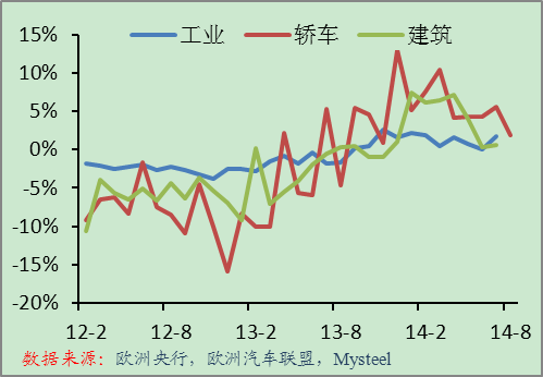 歐元區(qū)9月制造業(yè)PMI初值為50.5%,連續(xù)5個月環(huán)比下降,表明歐元區(qū)經(jīng)濟增長依舊低迷,加之當前歐元區(qū)低通脹未見起色,預(yù)計經(jīng)濟低增長可能在一段時間內(nèi)為歐元區(qū)經(jīng)濟的常態(tài)。目前歐洲央行采取逐步放寬政策的措施來改善歐元區(qū)信貸,但從當前來看,并沒有多大改善,預(yù)計歐洲央行將進一步放寬政策以挽救歐元區(qū)經(jīng)濟。但即便如此,在財政改革遲緩的情況下,貨幣政策對于經(jīng)濟的刺激效果不大。從歐洲下游行業(yè)的表現(xiàn)看,增長速度也是連續(xù)下滑。