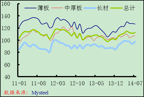 7月份德國中間商庫存小幅回升,在產(chǎn)量環(huán)比下降和凈出口環(huán)比持平的情況下,庫存上升表明鋼材需求明顯萎縮。分品種來看,薄板庫存小幅下降,而長材和中厚板庫存上升明顯。