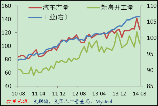 從下游行業(yè)看,8月份美國經(jīng)濟強勁增長態(tài)勢放緩,季節(jié)性因素可能是主因,但從同比增速看,美國經(jīng)濟強勁增長趨勢可能將放緩。8月份汽車產(chǎn)量同比增長4.5%,環(huán)比下降11.7%;工業(yè)產(chǎn)出同比增長4.8%,環(huán)比下降0.1%;新房開工量同比增長8%,環(huán)比下降14.4%。