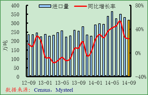 8月份美國鋼材進口量為333萬噸,同比增長27.4%,但環(huán)比下降5%。分品種看,與去年8月份相比,主要品種進口量均實現(xiàn)增長,依然是冷軋、鍍鋅板與中厚板的進口量增長最明顯,其中中厚板增長114%,冷軋增長65.7%,鍍鋅板增長46.1%。與今年7月份比,除半成品、長材、線材和螺紋鋼進口量環(huán)比增長外,其他品種均環(huán)比下降,其中螺紋鋼增長最快,為191.5%。最新的統(tǒng)計數(shù)據(jù)顯示,截至到2014年9月24日,9月份美國鋼材進口許可證數(shù)為317萬噸,高于去年9月水平,與8月份同期數(shù)據(jù)基本持平,預(yù)計今年9月份美國鋼材進口量同比仍將大幅增加,環(huán)比基本持平或略有增長。