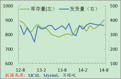 8月末美國金屬服務(wù)中心的鋼材庫存達到901.4萬短噸,環(huán)比增長3.1%,同比增長13.5%,創(chuàng)兩年來最高水平。8月份美國服務(wù)中心的發(fā)貨量為364萬短噸,同比略微增長,環(huán)比下降1.7%。按照供應(yīng)天數(shù)計算,8月末的鋼材庫存為2.5個月供應(yīng)量,7月末為2.4個月供應(yīng)量。2013年8月末為2.2個月供應(yīng)量。