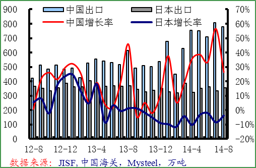 8月份中國鋼材出口778萬噸,同比增長26.4%,環(huán)比下降3.7%。9月份中國鋼材市場大幅下滑,鋼材出口進一步增強,PMI調(diào)查也顯示出口訂單增長,預(yù)計9月份中國鋼材出口依然保持在高水平。8月日本鋼鐵出口量為356萬噸,同比下降3.8%,環(huán)比增長6.7%,主要是日元貶值帶動。9月份日元大幅貶值,日本鋼材出口競爭力再次加強,預(yù)計出口量將繼續(xù)環(huán)比增長。