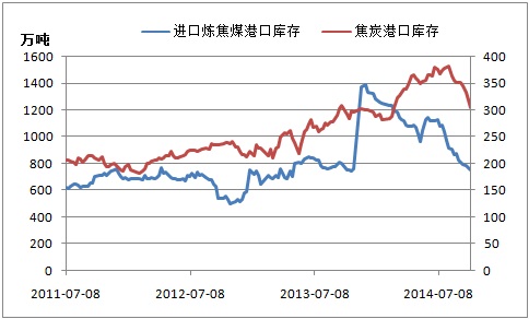 據(jù)我的鋼鐵網(wǎng)監(jiān)測,截至10月10日日照港、連云港、天津港焦炭庫存合計303.7萬噸,自8月8日達到380.6萬噸的年內最高位之后,港口庫存處于持續(xù)下滑態(tài)勢。不過,國內鋼企焦炭庫存仍保持低位,并無明顯補庫意愿,導致焦炭價格暫穩(wěn)運行,一旦后期鋼價持續(xù)堅挺,或推動鋼企入市采購。