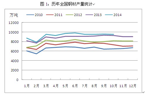 其一,鋼材產(chǎn)量增速有所回落。根據(jù)統(tǒng)計(jì),2014年1-10月,我國粗鋼產(chǎn)量68535萬噸,同比增長2.1%,增速同比減緩7.1個(gè)百分點(diǎn);鋼材產(chǎn)量93447萬噸,增長4.7%,減緩6.9個(gè)百分點(diǎn),國家政策的導(dǎo)向在這其中起了主要作用。一方面,2014年我國從政策上嚴(yán)格限制了鋼鐵等產(chǎn)能過剩行業(yè)的投資,由此導(dǎo)致除新疆地區(qū)外,其余省份全年均無高爐新建計(jì)劃,鋼鐵新增產(chǎn)能被控制;另一方面,京津冀地區(qū)持續(xù)霧霾天氣引發(fā)了公眾普遍擔(dān)憂,作為全國鋼鐵生產(chǎn)基地的河北省不時(shí)由于環(huán)境污染而被強(qiáng)制采取限產(chǎn)措施,雖然對(duì)于環(huán)保排污設(shè)施較為齊全的大型鋼廠影響有限,但中小型鋼廠的生產(chǎn)卻受到了較為明顯的影響,全國鋼材整體產(chǎn)量增速下滑也就變得順理成章