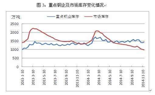 其三,鋼廠經(jīng)營風(fēng)險(xiǎn)有所上升。由于近兩年鋼價(jià)持續(xù)大幅下跌,市場上的鋼貿(mào)商苦不堪言,相較于家大業(yè)大且有地方政府扶持的鋼廠,鋼貿(mào)商的日子更加難熬,在持續(xù)虧損以及資金壓力下,超半數(shù)鋼貿(mào)商選擇退出。依然活躍于市場的鋼貿(mào)商在操作上也不復(fù)以往的大開大合,小心謹(jǐn)慎成為了多數(shù)鋼貿(mào)商的選擇,由此帶來的直接后果就是市場庫存向鋼廠庫存轉(zhuǎn)移。截止2014年10月末,全國主要城市鋼材庫存約為1043萬噸,較2013年同期相比大幅下降25.7%,與之相反的是,此時(shí)重點(diǎn)鋼企庫存增加到1414.3萬噸,較2013年同期上升9.8%,隨著鋼貿(mào)商 “蓄水池”功能的減弱,鋼廠對(duì)于價(jià)格調(diào)整以及生產(chǎn)策略的變動(dòng)將更為敏感,但與此同時(shí)鋼廠也將承擔(dān)更大的經(jīng)營風(fēng)險(xiǎn)。