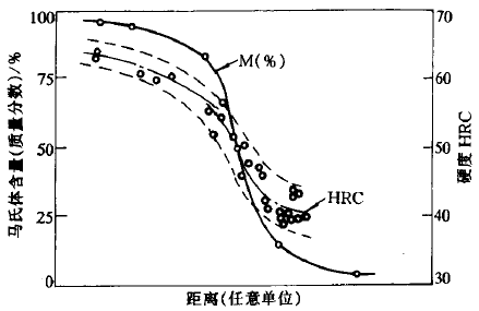 在未淬透的情況下,如何確定工件淬硬層深度呢?從理論上講,淬硬層應(yīng)為全馬氏體組織,但由于金相組織上淬硬區(qū)與非淬硬區(qū)無明顯界限,而馬氏體量由表面到心部是逐漸減少的。實(shí)際上馬氏體中混有一定量非馬氏體組織,如5~10%屈氏體時(shí),在顯微觀察及硬度測量上都不易察覺。因此,通常將具有50%馬氏體處確定為淬硬層邊界,即從工件表面到50%馬氏體區(qū)的距離定為淬硬層深度,因?yàn)楹?0%馬氏體區(qū)是硬度值急劇變化的地方,如下圖所示: