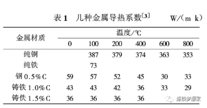 2000年以來銅冷卻壁以其良好的導熱能力和形成渣皮能力在我國高爐上得到廣泛的使用,目前全國約200座以上的高爐采用銅冷卻壁,尤其是在爐腹、爐腰和爐身下部等熱負荷較高的區(qū)域。高爐冷卻壁主要包括鑄鐵和純銅,另外還出現過鑄鋼冷卻壁。鑄鐵冷卻壁抗熱震性能差、導熱系數低。另外,其冷卻水管是鑄入鑄鐵本體內的,由于材質和膨脹系數的不同,形成氣隙層,而影響了傳熱。這些缺陷限制了鑄鐵冷卻壁的進一步發(fā)展。因此,從上世紀70年代歐洲開發(fā)和使用了銅冷卻壁,得到較好的效果。表1為幾種不同金屬導熱系數,可以看出純銅的導熱系數遠優(yōu)于其他材料。