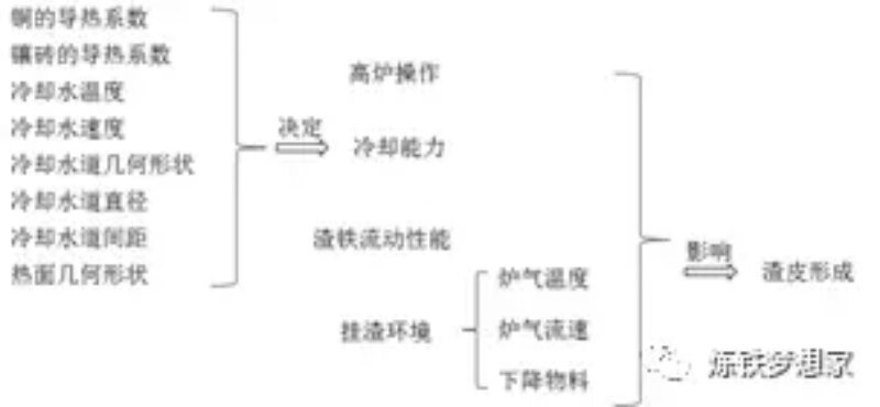 對于爐腹、爐腰及爐身下部等高熱負荷區(qū)域,無論是鑄鐵冷卻壁還是銅冷卻壁,渣皮的保護作用對冷卻系統的長壽至關重要。冷卻壁熱面存在穩(wěn)定渣皮時,塊狀帶物料、熔融渣鐵及高溫煤氣等不能直接接觸冷卻壁壁體,從而減少磨損、渣鐵侵蝕、“氫病”及有害元素等問題的發(fā)生,大幅提高冷卻壁壽命。渣皮的形成過程受多方面因素影響,如圖1所示。