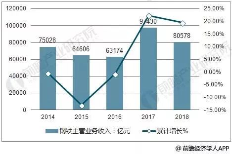 據(jù)前瞻產(chǎn)業(yè)研究院發(fā)布的《中國鋼鐵行業(yè)發(fā)展前景與投資戰(zhàn)略規(guī)劃分析報告》指出,2018上半年中國鋼鐵行業(yè)主營業(yè)務(wù)收入達(dá)到30525億元,累計增長15.8%?;仡?012-2017年鋼鐵行業(yè)營業(yè)收入情況:近六年來,我國鋼行業(yè)營業(yè)收入較為穩(wěn)定,2015年以來累計增長率逐漸回暖。中國鋼鐵行業(yè)將繼續(xù)保持穩(wěn)中有長趨勢,預(yù)計2018年中國鋼鐵行業(yè)營收將突破80000億元。
