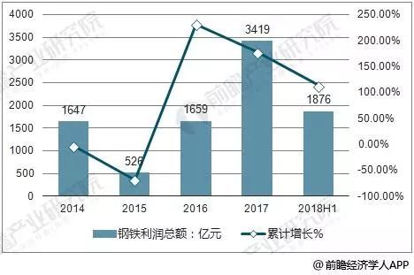 近年來,鋼鐵行業(yè)盈利能力持續(xù)穩(wěn)定增長,2017年鋼鐵行業(yè)利潤總額達(dá)到3419億元,與2016年相比增長率高達(dá)177.8%;2018上半年行業(yè)利潤達(dá)到1876億元,增長率為113%,鋼鐵行業(yè)利潤的整體向好。