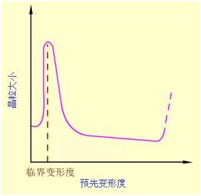 (2)預(yù)先變形度 變形度的影響主要與金屬變形的均勻度有關(guān)。變形越不均勻, 再結(jié)晶退火后的晶粒越大。變形度很小時(shí),因不足以引起再結(jié)晶,晶粒不變。當(dāng)變形度達(dá)到2~10%時(shí),金屬中少數(shù)晶粒變形,變形分布很不均勻,所以再結(jié)晶時(shí)生成的晶核少,晶粒大小相差極大,非常有利于晶粒發(fā)生吞并過程而很快長(zhǎng)大,結(jié)果得到極粗大的晶粒。使晶粒發(fā)生異常長(zhǎng)大的變形度稱作臨界變形度。生產(chǎn)上應(yīng)盡量避免在臨界變形度范圍內(nèi)的塑性變形加工。超過臨界變形度之后,隨變形度的增大,晶粒的變形更加強(qiáng)烈和均勻,再結(jié)晶核心越來越多,因此再結(jié)晶后的晶粒越來越細(xì)小。但是當(dāng)變形度過大(約≥90%)時(shí), 晶??赡茉俅纬霈F(xiàn)異常長(zhǎng)大,一般認(rèn)為它是由形變織構(gòu)造成的。