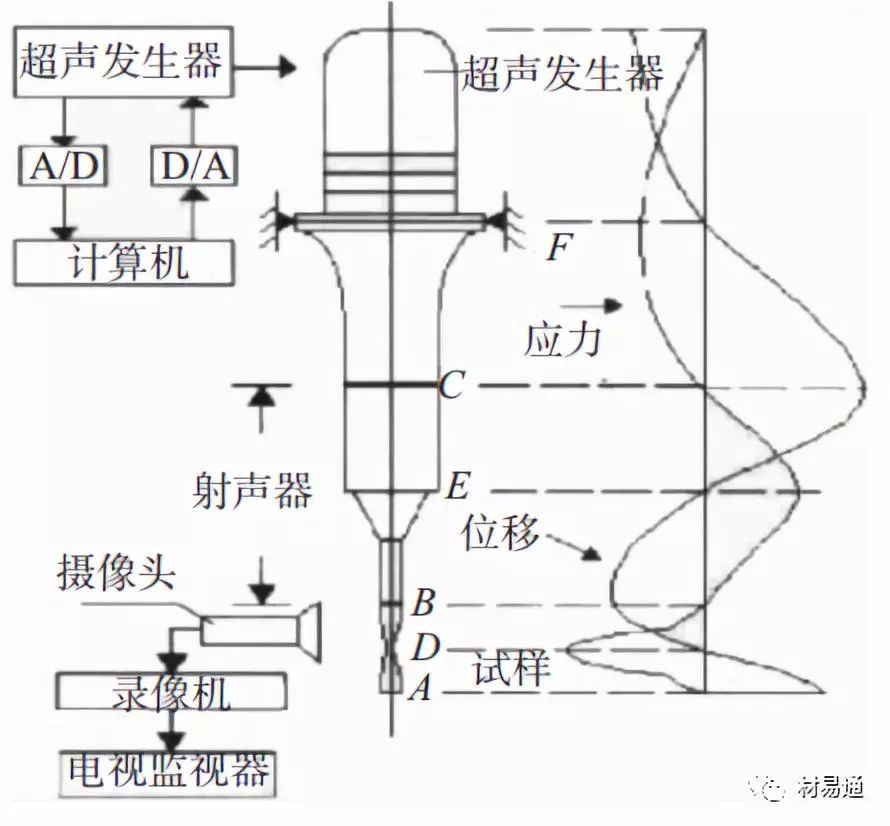 試驗裝置主要包括:(1)超聲頻率發(fā)生器(將超聲正弦波電信號由50Hz轉(zhuǎn)變?yōu)?/span>20kHz);(2)壓力陶瓷換能器(將電源提供的電信號轉(zhuǎn)化成機械振動信號);(3)位移放大器(放大位移振幅使試樣獲得所需的應(yīng)變振幅)。試驗裝置原理:由壓電陶瓷換能器、位移放大器和試樣組成的超聲疲勞試驗機構(gòu)成了一個力學(xué)振動系統(tǒng),試樣的加載是由外加信號激勵試樣發(fā)生諧振,在試樣中產(chǎn)生諧振波來實現(xiàn)。