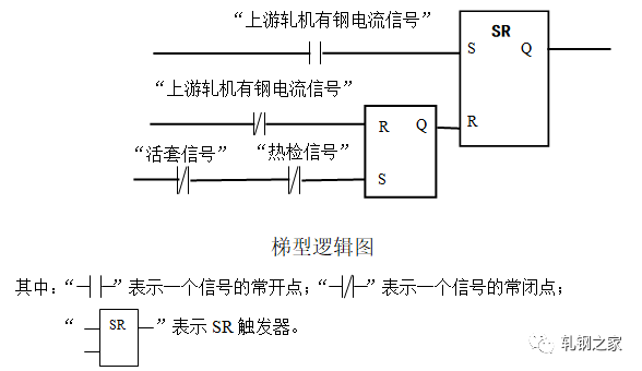在軋件頭部進(jìn)入活套后面軋機(jī)前不允許起套輥升起;在軋件頭部進(jìn)入活套后面軋機(jī)后起套輥必須立即升起。當(dāng)軋件尾部離開(kāi)活套前面軋件時(shí),起套輥必須立即下降。為了準(zhǔn)確地起落套,我們首先,在活套的起落套的邏輯控制程序中設(shè)置了RS觸發(fā)器。只要下游機(jī)架“有鋼”活套就不能再次起落套。編程如下(梯型邏輯圖):其次,在起套和落套的處理上對(duì)延時(shí)時(shí)間采用了長(zhǎng)度系數(shù)補(bǔ)償?shù)乃惴?,即在?jì)算定時(shí)器的延時(shí)時(shí)間過(guò)程中將線材要走的長(zhǎng)度(如兩機(jī)架間的距離)乘以一個(gè)百分比。這樣就可以:一、消除由于CPU軟件系統(tǒng)本身運(yùn)行周期過(guò)長(zhǎng)造成的定時(shí)計(jì)算誤差;二、靈活地適應(yīng)電氣開(kāi)關(guān)和機(jī)械上氣閥等的動(dòng)作滯后的不一致性,以使起套輥能較準(zhǔn)確地升起和落下。