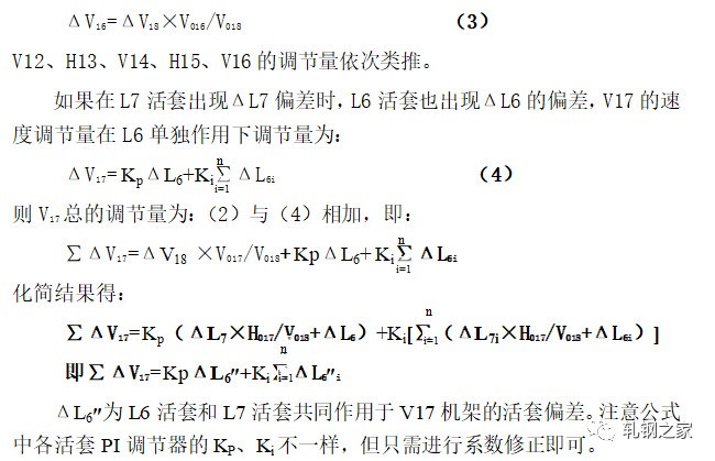 當(dāng)活套一旦形成以后,活套的實(shí)際高度立即由活套掃描器測(cè)得的值經(jīng)過(guò)PI調(diào)節(jié)器,輸出一個(gè)控制信號(hào),通過(guò)控制上游軋機(jī),使活套大小得到調(diào)節(jié),使活套保持在設(shè)定的高度范圍。速度調(diào)節(jié)量是按逆流調(diào)速的方法,按同樣比例對(duì)軋機(jī)的工作速度進(jìn)行級(jí)聯(lián)調(diào)節(jié)。假如活套L7出現(xiàn)高度差為ΔL7,則V18機(jī)架的速度調(diào)節(jié)是: