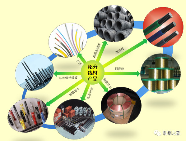 線材的用途非常廣泛,除建筑用線材等可直接被應(yīng)用的成品之外,一般都要經(jīng)過深加工才能制成產(chǎn)品。深加工的方式有熱鍛、溫鍛、冷鍛、拉拔、擠壓、回轉(zhuǎn)成形和切削等,為了便于進(jìn)行這些深加工,加工之前需要進(jìn)行退火、酸洗等處理。加工后為保證使用時的機(jī)械性能,還要進(jìn)行淬火、正火或滲碳等熱處理。有些產(chǎn)品還要進(jìn)行鍍層、噴漆、涂層等表面處理。部分線材產(chǎn)品如下圖所示。