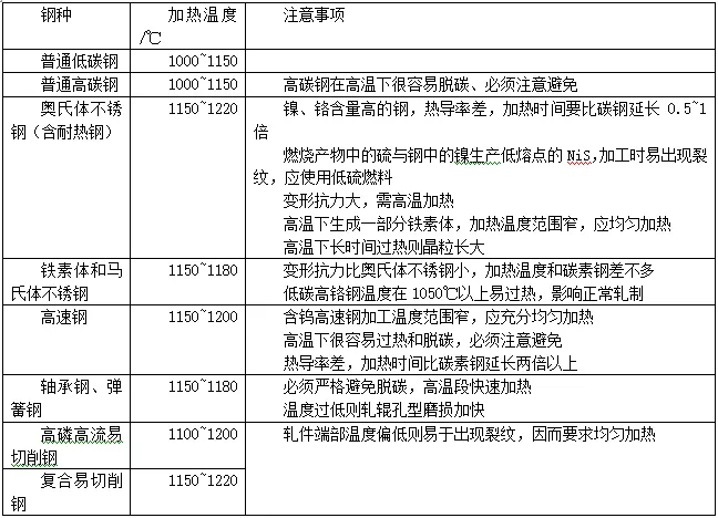 特別注意的是:對于碳鋼加熱溫度一般不能大于1300℃,大于此溫度,其一,鋼坯表面的氧化鐵皮會熔化(純氧化鐵皮的熔點為1377~1565℃,含有雜質(zhì)時降到1300~1350℃),從鋼表面上掉下來,露出新的表面,燒損迅速增加。其二,當加熱溫度大于1300℃時,鋼坯很有可能會出現(xiàn)過熱或過燒。生產(chǎn)其它鋼種時更應(yīng)該注意最高加熱溫度。