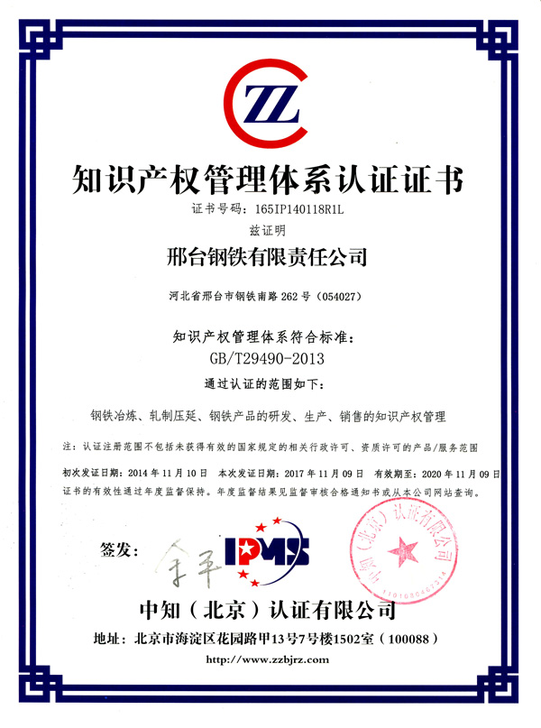 邢鋼作為邢臺(tái)市唯一一家企業(yè)入選知識(shí)產(chǎn)權(quán)管理規(guī)范試點(diǎn)工作從2012年6月啟動(dòng),2013年12月被國(guó)家知識(shí)產(chǎn)權(quán)局認(rèn)定為第一批國(guó)家級(jí)知識(shí)產(chǎn)權(quán)優(yōu)勢(shì)企業(yè),2014年11月邢鋼首次通過中知(北京)認(rèn)證有限公司知識(shí)產(chǎn)權(quán)管理體系認(rèn)證。截至目前,公司累計(jì)獲得國(guó)家專利近300項(xiàng),擁有內(nèi)領(lǐng)先或國(guó)際領(lǐng)先的省級(jí)以上科研成果70余項(xiàng),并在今年8月世界鋼鐵企業(yè)技術(shù)競(jìng)爭(zhēng)力和專利技術(shù)能力評(píng)比中分別排名第34位和27位。