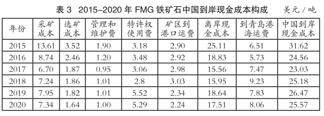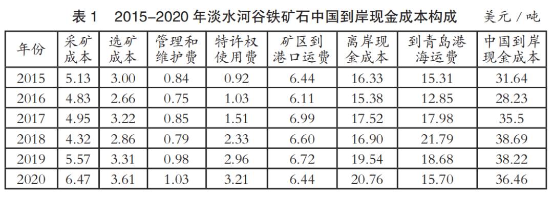 中國進(jìn)口鐵礦石到岸成本主要由離岸現(xiàn)金成本和海運(yùn)成本兩部分構(gòu)成。表1至表4為2015-2020年國際四大礦鐵礦石中國到岸現(xiàn)金成本構(gòu)成情況(數(shù)據(jù)來源:AME),其中離岸現(xiàn)金成本由采礦成本、選礦成本、管理和維護(hù)費(fèi)、特許權(quán)使用費(fèi)和礦區(qū)到港口運(yùn)費(fèi)構(gòu)成;中國到岸現(xiàn)金成本由離岸現(xiàn)金成本和到青島港海運(yùn)費(fèi)構(gòu)成;該成本數(shù)據(jù)僅為現(xiàn)金成本,不含國際四大礦的融資、折舊費(fèi)用。