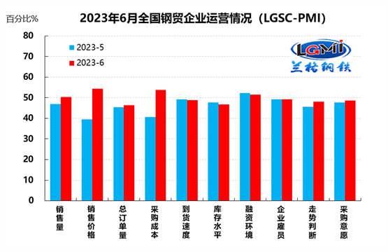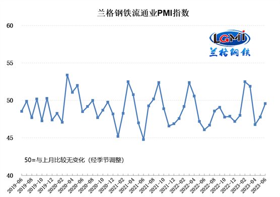 蘭格鋼鐵網統(tǒng)計發(fā)布的2023年6月份鋼鐵流通業(yè)PMI總指數(shù)為49.6%,比上月上升1.8個百分點,在收縮區(qū)間內繼續(xù)回升。從分類指數(shù)看,構成鋼鐵流通業(yè)PMI的10個分類指數(shù)6升3降1平,其中銷售量、銷售價格、總訂單量、采購成本、走勢判斷和采購意愿6項指數(shù)上升,到貨速度、庫存水平和融資環(huán)境3項指數(shù)下降,企業(yè)雇員1項指數(shù)持平。