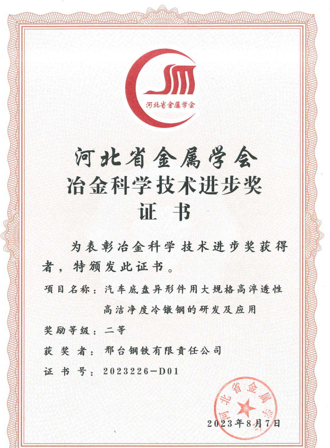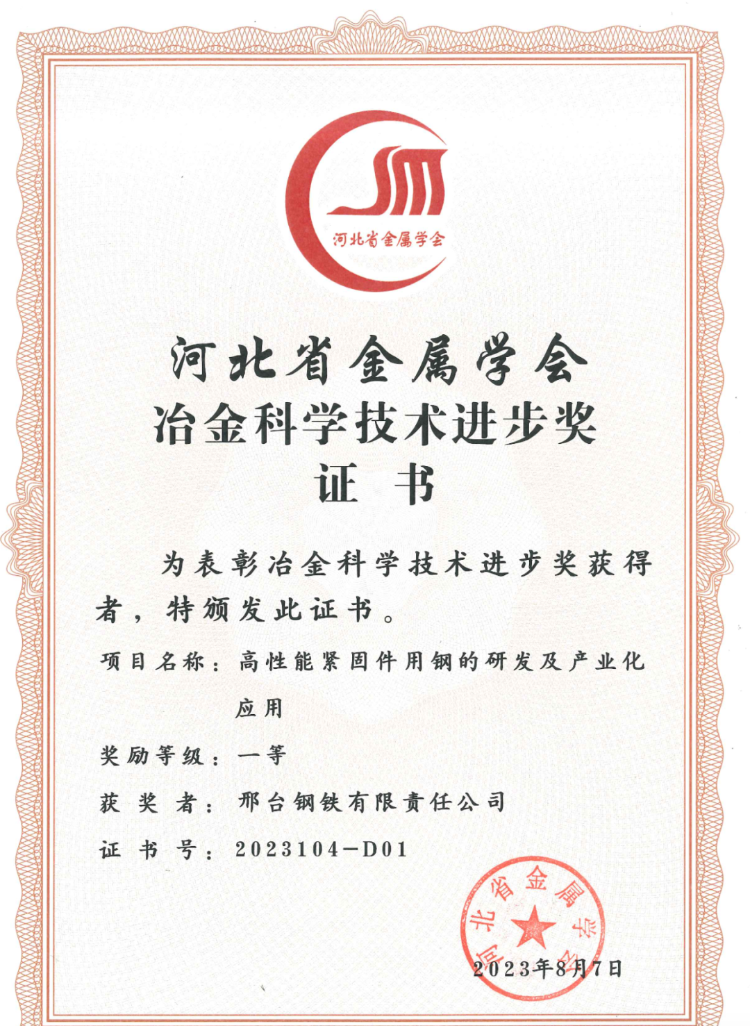 近日,邢臺鋼鐵有限責任公司兩項科技研發(fā)項目“高性能緊固件用鋼的研發(fā)及產(chǎn)業(yè)化應用項目”“汽車底盤異形件用大規(guī)格高淬透性高潔凈度冷鐓鋼的研發(fā)及應用”得到河北省金屬學會專家評審委員會的高度認可,分別榮獲2023年度的 “河北冶金科學技術(shù)獎”一、二等獎。