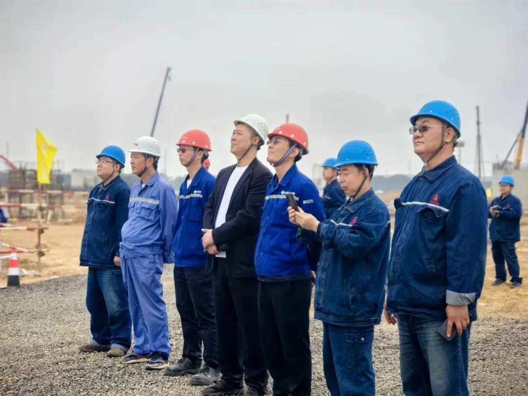 在激情似火、掌聲雷鳴的項目施工現場,隨著公司董事長張育明“首吊開始”的工作指令,在公司副總經理馬保良、韓清連及現場8支施工隊伍近450名員工的共同見證下,高聳矗立的塔吊緩緩將30.6米的鋼結構成功吊起,并順利移入基礎杯口內。