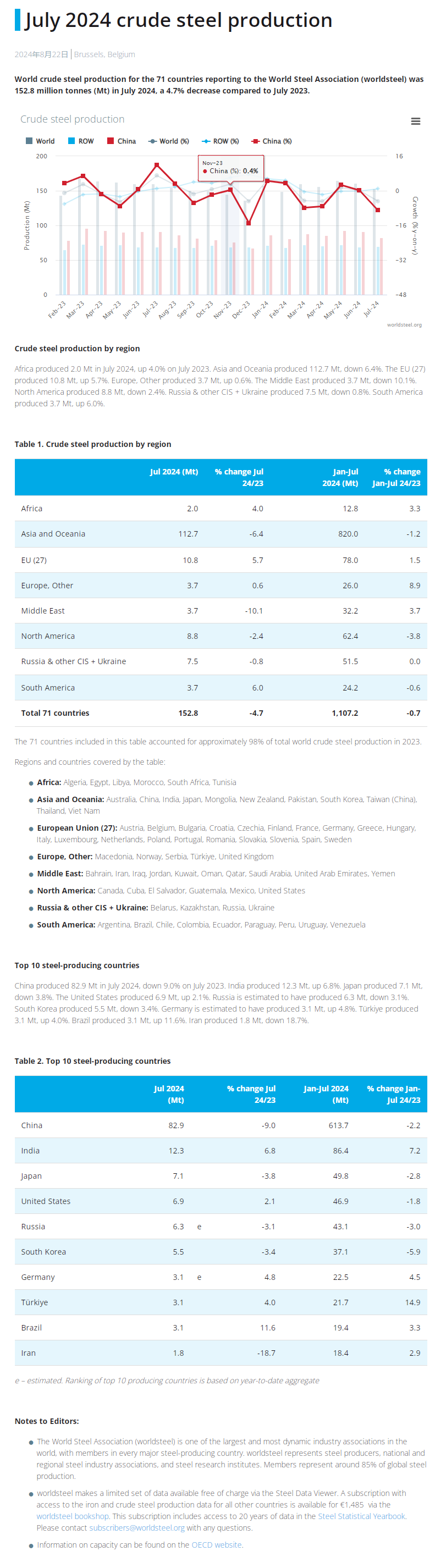 來(lái)源:世界鋼鐵協(xié)會(huì) 發(fā)布時(shí)間:2024年08月27日 點(diǎn)擊數(shù):