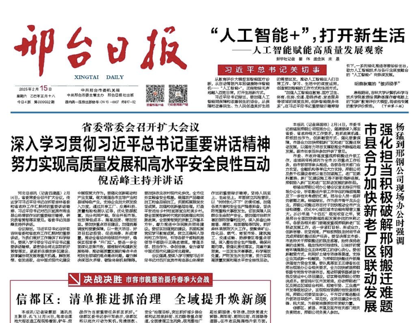 2月14日,市委書記楊猛到邢鋼公司現(xiàn)場(chǎng)辦公,強(qiáng)調(diào)要深入落實(shí)省委、省政府相關(guān)工作要求,搶抓政策機(jī)遇、積極擔(dān)當(dāng)作為,創(chuàng)新融資方式、強(qiáng)化要素保障,市縣合力加快邢鋼新廠區(qū)和老廠區(qū)搬遷聯(lián)動(dòng)發(fā)展,以強(qiáng)有力項(xiàng)目支撐助推全市跨越趕超發(fā)展。副市長(zhǎng)李亞林參加并講了意見。