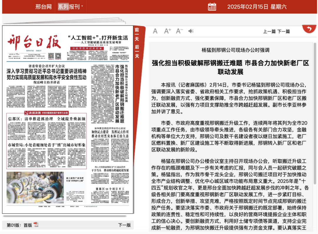 楊猛在邢鋼公司辦公樓會(huì)議室主持召開現(xiàn)場(chǎng)辦公會(huì),聽取搬遷升級(jí)工作存在的瓶頸難題及下一步有關(guān)考慮的匯報(bào),同與會(huì)人員一起研究破題之策。楊猛指出,作為我市骨干龍頭企業(yè),邢鋼公司搬遷項(xiàng)目對(duì)于加快推動(dòng)全市產(chǎn)業(yè)結(jié)構(gòu)調(diào)整、優(yōu)化中心城區(qū)城市功能布局意義重大。2025年是“十四五”規(guī)劃收官之年,更是邢臺(tái)全面加快跨越趕超發(fā)展步伐的沖刺之年。各級(jí)各相關(guān)部門要高度重視邢鋼新老廠區(qū)聯(lián)動(dòng)發(fā)展工作,進(jìn)一步緊盯目標(biāo)、形成合力,創(chuàng)新舉措、攻堅(jiān)克難,嚴(yán)格按照既定時(shí)間節(jié)點(diǎn)完成邢鋼的搬遷投產(chǎn)任務(wù)。要堅(jiān)決落實(shí)市委、市政府關(guān)于邢鋼搬遷的既定部署,始終保持政策的連貫性、穩(wěn)定性和可持續(xù)性,以良好的營(yíng)商環(huán)境提振企業(yè)主體和職工的信心決心。要?jiǎng)?chuàng)新融資方式,利用好土儲(chǔ)專項(xiàng)債等渠道,支持企業(yè)完成新一輪融資,為邢鋼加快搬遷升級(jí)提供強(qiáng)有力資金支撐。要認(rèn)真落實(shí)王正譜省長(zhǎng)在邢臺(tái)現(xiàn)場(chǎng)辦公會(huì)相關(guān)要求,全力加快威縣邢鋼鐵路專用線專項(xiàng)債項(xiàng)目,推動(dòng)邯黃鐵路威縣專線及貨運(yùn)中心項(xiàng)目建設(shè),切實(shí)降低邢鋼公司物流成本。要堅(jiān)持片區(qū)開發(fā)思維,啟動(dòng)邢鋼老廠區(qū)及周邊區(qū)域綜合利用、招商引資、工業(yè)遺產(chǎn)開發(fā)等規(guī)劃設(shè)計(jì),實(shí)現(xiàn)現(xiàn)有資源的有效盤活利用。邢鋼公司要堅(jiān)定信心,千方百計(jì)推進(jìn)搬遷升級(jí)項(xiàng)目早投產(chǎn)、早見效,在項(xiàng)目建設(shè)中當(dāng)先鋒、挑大梁,為投資消費(fèi)質(zhì)效年貢獻(xiàn)力量。
