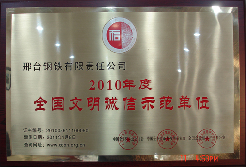 邢鋼榮獲2010年度“全國文明誠信示范單位” 稱號(hào)